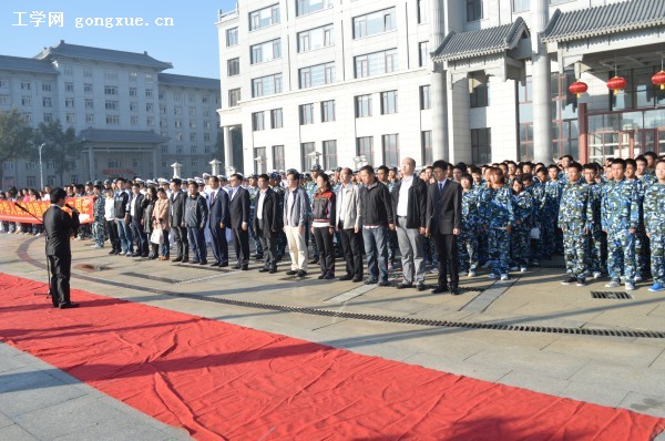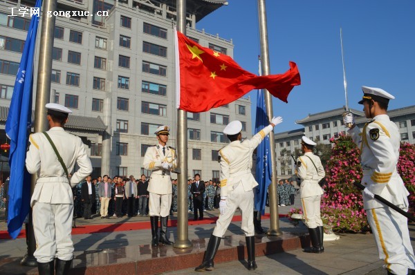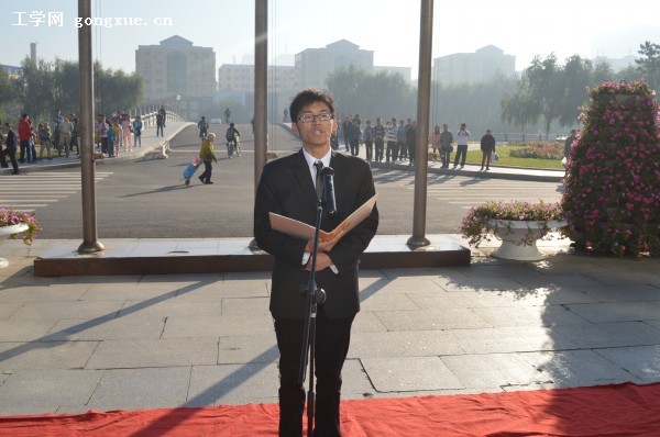7点30分,在高昂的音乐声中,升旗仪式正式开始。国旗护卫队队迈着整齐的步伐从工学桥缓缓入场,列队,授旗。随着广场上响起庄严而圣神的《义勇军进行曲》,鲜艳的五星红旗在晨风中冉冉升起,迎风飘扬。国歌闭,五星红旗升到旗杆顶端。在飘扬的五星红旗下,材化学院学生代表、校陈赓奖学金获得者赵相禹同学发表了以爱国情怀为主题的国旗下的演讲。随后,国防学院代表、校优秀学生干部崔晋带领全体参会人员进行国旗下宣誓,同学们的爱国热情再一次高涨。