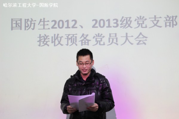 12月5日18时30分,国防生2012、2013级党支部在11号楼122教室召开接收预备党员大会。此次会议由党支部书记丁乙珊主持,宣传委员黄万勇、组织委员胡聪等支部成员参加了本次大会。