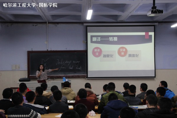 为了帮助广大国防生有效备战英语四级,提高学习英语的兴趣。12月5日16时10分,由国防教育学院主办的英语四级辅导在11号楼124教室如期举行,学院邀请哈尔滨新东方老师李衍葳来校,针对英语写作和翻译进行了讲解,2014级全体国防生参加了本次讲座。