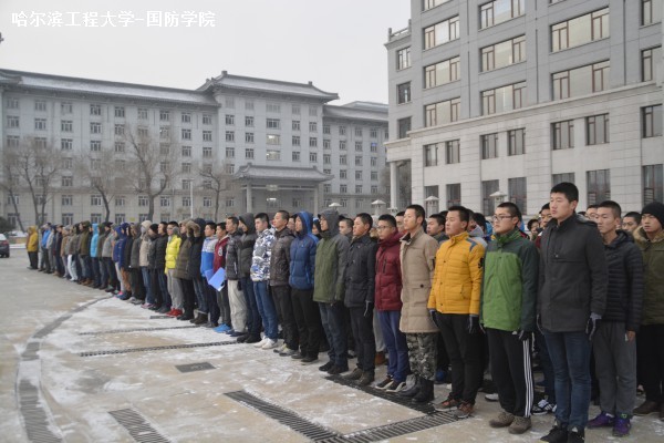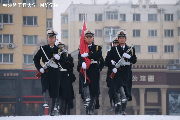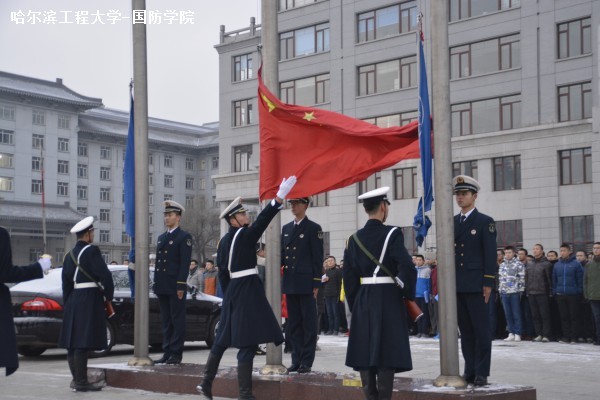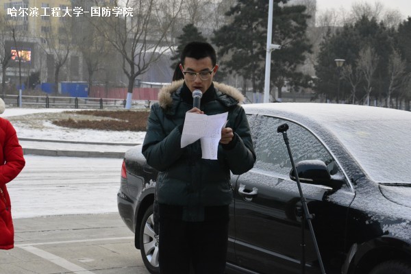 伴着12月纷飞的雪花,英姿飒爽的国旗护卫队队员步伐矫健、仪态庄严地跨过工学桥。在《义勇军进行曲》的伴奏中,鲜艳的五星红旗冉冉升起,全体学生静穆注视,向国旗致敬。随后,我院和外语系学生代表分别在国旗下发言。围绕着“心系国防”这一主题,两位同学呼吁大学生立志报国,以实际行动来为国防事业做出贡献。
