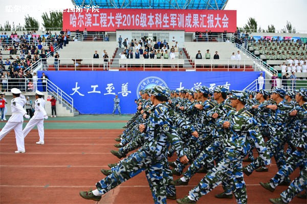 军训团进行了一系列经典、精彩的军训科目表演。在女子连队列表演中,女兵组成了我校英文缩写HEU、2016、舵轮等图案。随后,三营的300名学生、四营的400名学生组成的表演方阵,分别以严整的军容、整齐有力的动作,虎虎生威地表演了刺杀操和擒敌拳。