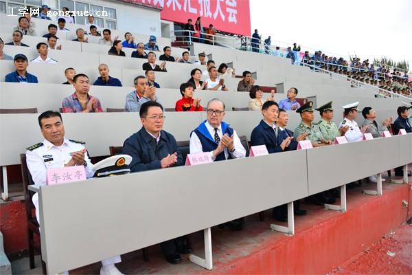 16时,军号准时吹响。海军国防生国旗护卫队入场,升校旗,唱校歌。