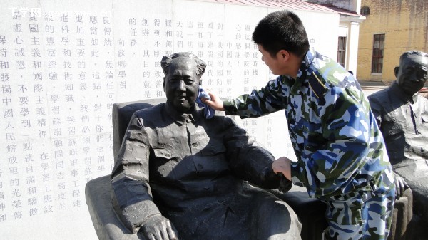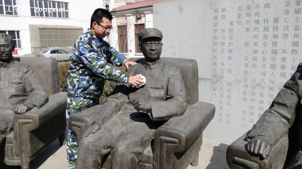 3月31日午12时50分,国防教育学院海魂志愿者们在十三公寓前集合完毕并统一带队到助学超市前,清理受命群雕铜像。 清理毛主席像